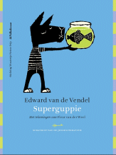 door Lieke van Duin en Jos van HestSuperguppieEdward van de Vendel & Fleur van der Weel, 2003> Boek terug naar bovenTerecht zijn Edward van de Vendel en Fleur van der Weel sámen bekroond voor Superguppie: het boek is, in de originele versie met de soepele kaft, een perfecte eenheid van tekst, beeld en vormgeving. Het is zon zeldzaam bundeltje gedichten voor kinderen waar, als je het in de hand neemt, alles aan klopt: de gedichten van Edward van de Vendel zijn origineel en toegankelijk; de tekeningen van Fleur van der Weel grappig en levendig; de ene steunkleur, lichtgroen, is inventief gebruikt; de compositie van de dubbele paginas is in evenwicht, inclusief de plaatsing van de tekst; belettering en illustraties zijn op elkaar afgestemd en de omslag vormt een smakelijk voorproefje voor het binnenwerk. Voor de versie in deze Schatkist-reeks geldt dit ook, met uitzondering van de omslag. Die heeft, evenals de andere delen, een harde kaft met de uniforme belettering van de serie. De gedichten verrassen door hun onbevangen kijk op de wereld en de onverwachte wendingen, waardoor gewone dagelijkse dingen bijzonder worden: Er lag een merel / neergevouwen / dood op het station. Neergevouwen, alsof iemand de vleugels netjes heeft geschikt. Een tuintje wordt niet geharkt en gewied, maar opgetut: We tutten ons tuintje op / en kammen het gras, / make-uppen de randjes / langs het terras:/ overal plantjes met lippenstiftkleuren. Een dekbed is een envelop waarin de ik-figuur verstuurd wordt: Mama stuurt me s avonds op / in mijn dekbedenvelop. / Nachtpost, zegt ze,/. Als de pleister van je knie af moet, doet dat pijn, maar niet de ik-figuur huilt, maar Pleistertjes krijsen zo zielig / van au. En de brievenbus is een bek waar eten in gestopt wordt: het nieuws. / Papieren eten. Zelfs het gasfornuis is niet te banaal om met een poëtische blik te worden beschreven: Luister, / luister, / luister: / ontploffend gasgefluister. Soms wordt het gewone zelfs bizar: de zweetdruppeltjes in opas wenkbrauwen zijn dan druppeltjesbiggen / om in stro te gaan liggen. En soms herinnert een regel aan een ander gedicht: De zon schijnt alle grote mensen plat / ze liggen slap als plantjes doet onwillekeurig denken aan het bekende gedicht over de sla-plantjes in september van Rutger Kopland. De laatste regels van het titelgedicht zijn een knipoog naar Hamlet: Superguppie in mijn kom, / Er nog zijn - / daar gaat het om. Fleur van der Weel maakte eigenzinnige beelden bij de gedichten: de ik-figuur is een eigenwijs hondje met een grote kop en rafelige oren. Haar prenten geven geestig commentaar op- of een onverwachte interpretatie aan de tekst of voegen er iets aan toe dat niet in de tekst staat. Zo tekent ze in het gedicht Slaap, waarin de ik-figuur in bed ligt, terwijl er beneden feest gevierd wordt, een stoet feestende muizen onder het bed. Telefoon begint zo: Als je belt, / trek je een lijntje. Bij dit gedicht tekent ze het touwtje-met-blikje-als-hoorn waarmee kinderen telefoontje spelen, en laat de ik-figuur verstrikt raken in het touw, het lijntje. Op deze manier vertelt ze met haar tekeningen een eigen subverhaal, waardoor het geheel van tekst en beeld meer is dan de som der delen. > Leeftijd en (voor-)lezen terug naar bovenDit poëzie-prentenboekje is geschikt voor kinderen vanaf zes jaar en laat zich eenvoudig voorlezen. Lees bij voorkeur één gedicht per keer voor, of hooguit een paar. Het zijn bij uitstek gedichten om te horen met je oren; wie ze alleen leest met de ogen, mist de muzikaliteit van klank en ritme. Daarom is het ook goed om hetzelfde gedicht een aantal keren achter elkaar voor te lezen. > Groepsgesprek terug naar bovenEen goede manier om een kinderboek als geheel in de klas te bespreken is ontwikkeld door Aidan Chambers. Chambers is een Engelse kinderboekenschrijver die in 2002 de Hans Christian Andersenprijs kreeg. Maar hij is ook specialist in leesbevordering en hij beschrijft deze aanpak, ontstaan in de praktijk van de basisschool, in zijn boeken Vertel eens en De leesomgeving (Biblion 2001). De werkwijze is te gebruiken in de hele basisschool. De Vertel eens-aanpak komt erop neer dat de groep in ongeveer drie kwartier over een boek praat naar aanleiding van vragen die u als leerkracht stelt. Chambers stelt de volgende basisvragen voor, die meestal veel reactie ontlokken: