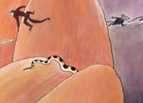 Je klautert een volgende rots op… Die is nog hoger… Je klautert de hoge rots af… Je staat stil op een weitje en je kijkt naar de rivier... Opeens hoor je gesis. Je kikt achterom. Een slang! Oei! Wegwezen! Vlug klim je een rots op… En weer af... Een volgend rots op… En weer af... En weer op... En weer af… Je wordt moe, je hijgt… Houd je ballon vast!