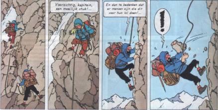 Dit zijn de laatste zinnen van het eerste hoofdstuk. Met het gegeven van die ontbrekende linkervoet eindigt het hoofdstuk zo onverwacht en spannend dat je meteen door wil lezen. Zo’n eindzin van een hoofdstuk heet een cliffhanger. (Letterlijk een klifhanger: alsof iemand aan de rotsen boven een afgrond hangt. Dit is treffend verbeeld in Kuifje in Tibet van Hergé, op het laatste plaatje van pagina 39, waar kapitein Haddock aan een klif hangt en op het punt staat naar beneden te vallen:
