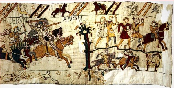 Het is het beroemde tapijt van Bayeux, een halve meter hoog en wel 70 meter lang. Het beeldt het gevecht uit van Willem de Veroveraar, die in 1066 vanuit Normandië Engeland binnenviel en de Angelsaksische koning Harold versloeg. Het tapijt hangt in een museum in de stad Bayeux in Frankrijk. Het is gemaakt van linnen, geborduurd met gekleurde wol. Zie je nog meer verschillen met Waar is de taart?