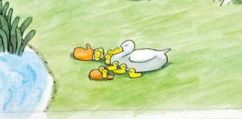 Groepsgesprek over het boek terug naar bovenEen groepsgesprek over dit boek moet letterlijk rond het boek plaatsvinden, omdat het belangrijk is om steeds allerlei details op te sporen en te kunnen aanwijzen. Daarom kan dat alleen in een kleine groep. Het belangrijkste is samen kijken en erover praten. Volg samen niet alleen wat er gebeurt met de taart, maar ook met de voetbal, de fles drank, de staartveren van de ooievaar, de sloffen van mevrouw Hond, de hark, de ballon van kindje Big, het mandje van juffrouw Kat, de Nijntjeknuffel, het elfde eendekuikentje, de parasol van mevrouw Varken, enzovoort. Om het opmerkingsvermogen te stimuleren, stelt u vragen. Begin met het boek open te leggen zodat je voor- en achterkant als één prent ziet: