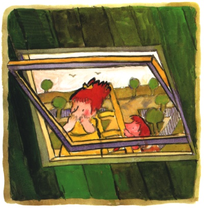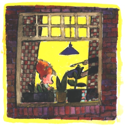 Dit is Ella achter een raam van haar huis. Schilder een raam van het huis waar jij woont met jezelf erachter. Staan er bij jou ook planten op de vensterbank? Zijn er ook gordijnen? Kijk naar de schilderingen in het boek: je ziet veel tegels en steentjes, hokjes op gordijnen, rondjes op muren, stippen en strepen. Kijk op jouw schildering waar je vierkantjes, rondjes, stippen of strepen kunt zetten. Maak van alle schilderingen een tentoonstelling.